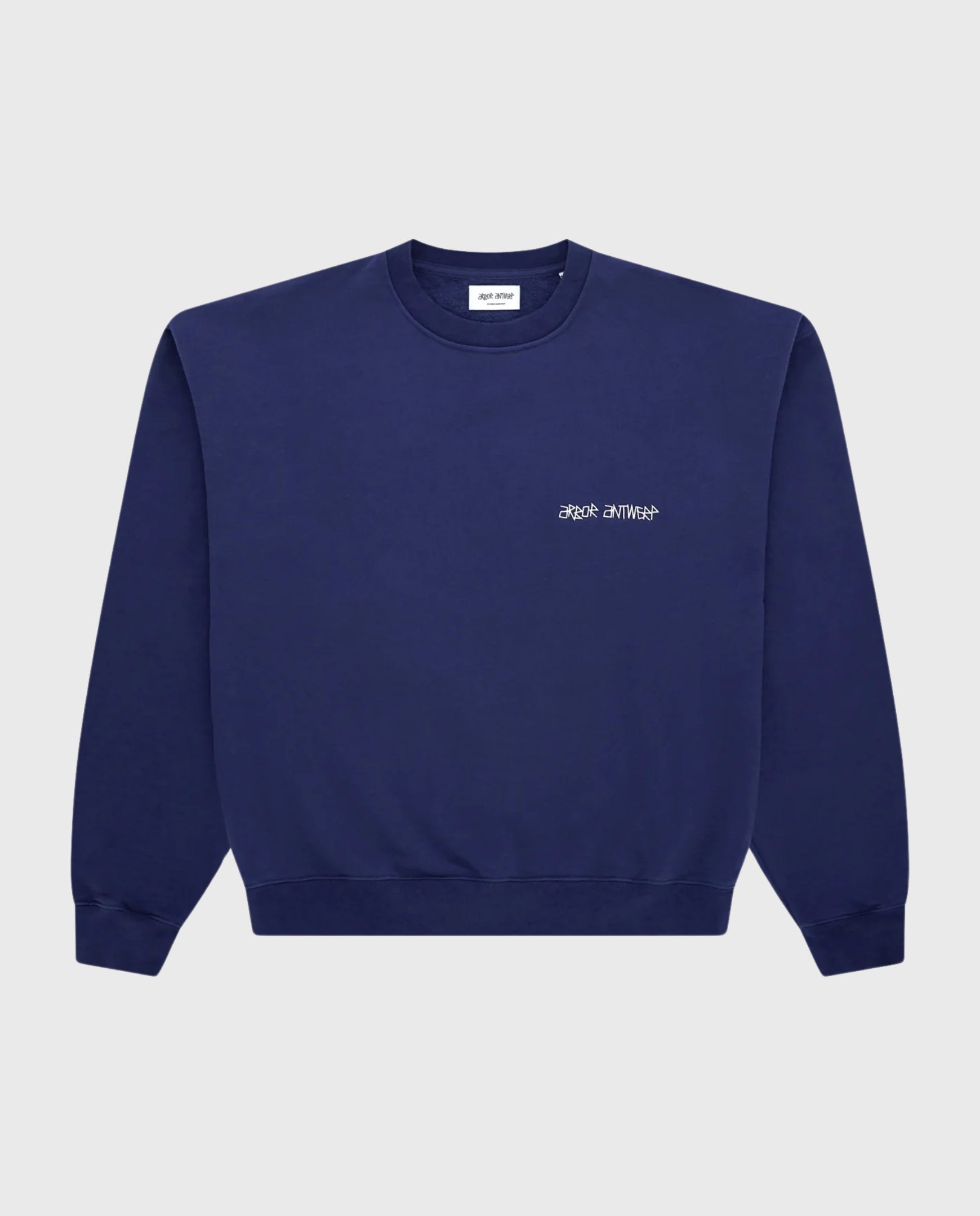 Deze donkerblauwe crewneck van Arbor Antwerp heeft een lichte oversized fit. Gemaakt van 100% organisch katoen. Roze blossom op de achterkant met overlappende tekst. De linkerborst heeft een subtiel logo van Arbor Antwerp.