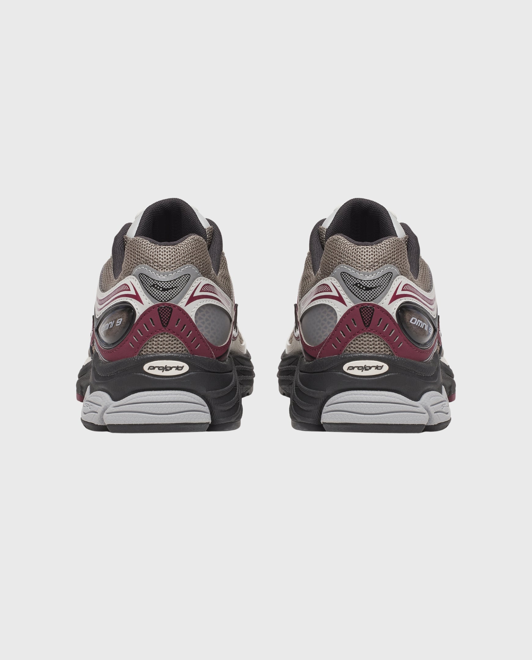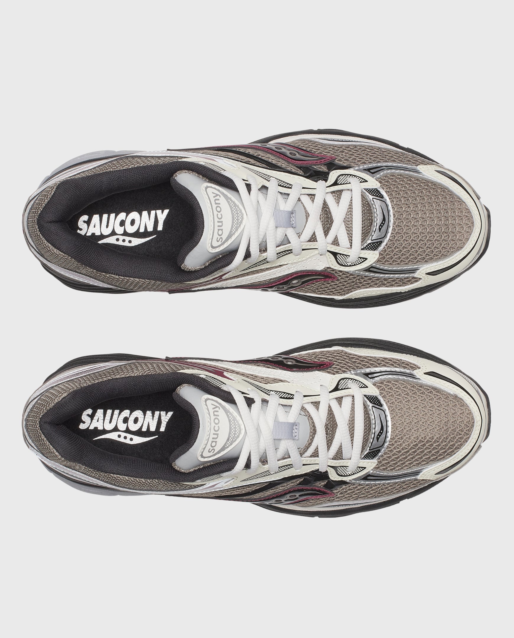 De Saucony ProGrid Omni 9 keert terug als een moderne remake van een hardloopicoon uit de jaren 2000. Met zijn beige mesh basis, contrasterende burgundy en zilveren overlays en reflecterende details, is dit model zowel stijlvol als functioneel.