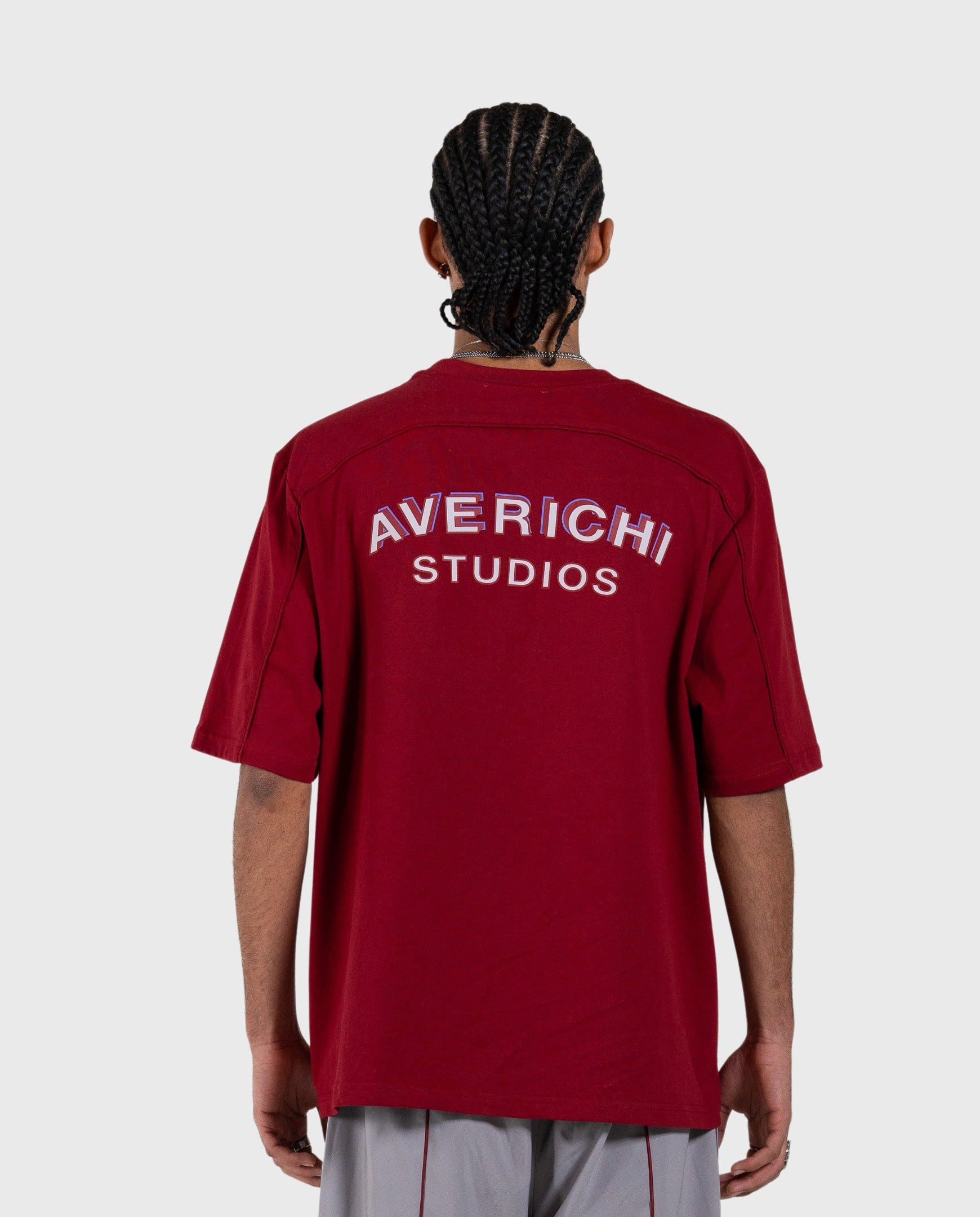 Het Signature A T-shirt is een moderne essential. In rijk bordeauxrood, met een opvallende 'A' op de voorkant en "Averichi Studios" op de achterkant.