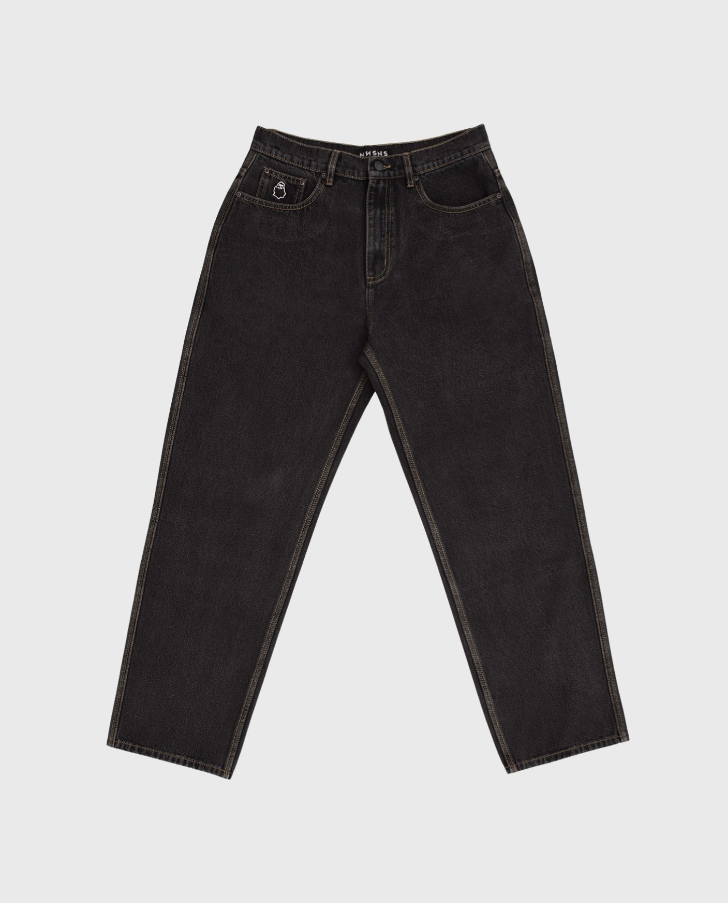 De NNSNS Bigfoot Blacked Washed Denim, afgewerkt met gele stiksels. Perfecte zwarte baggy jeans broek.