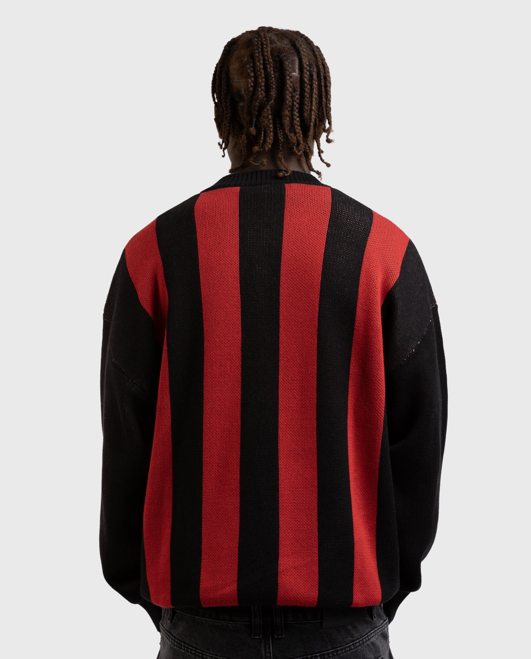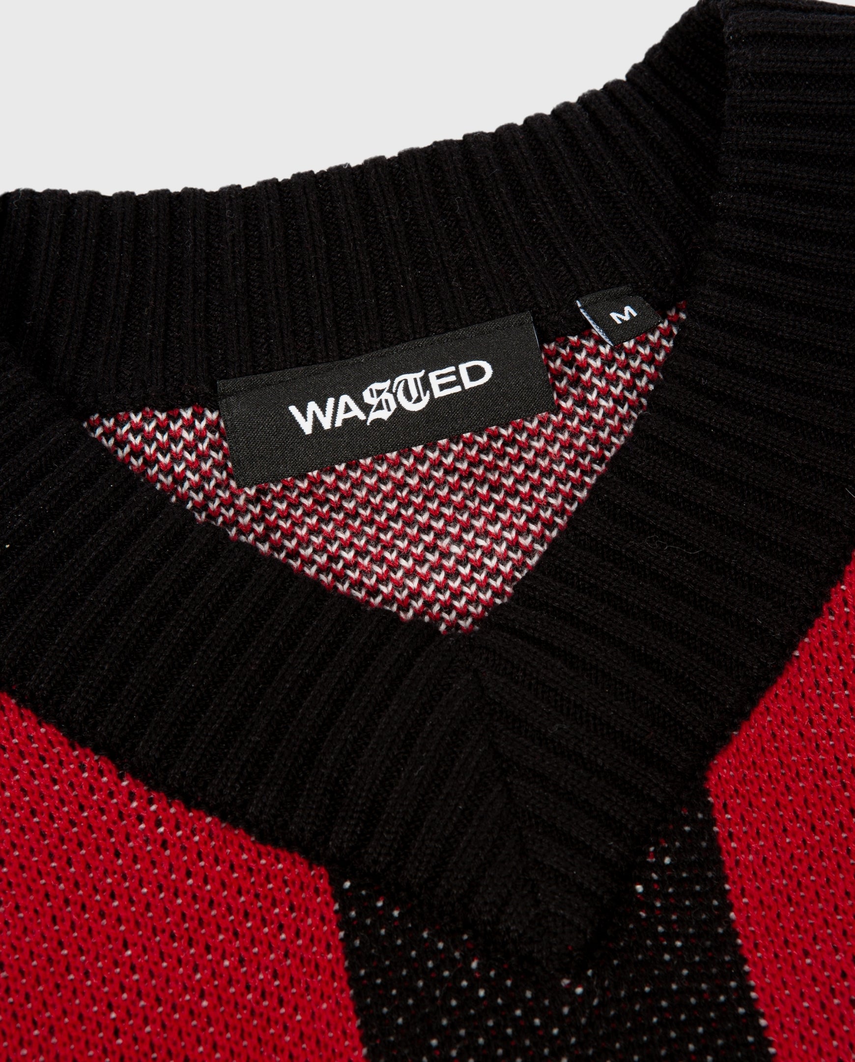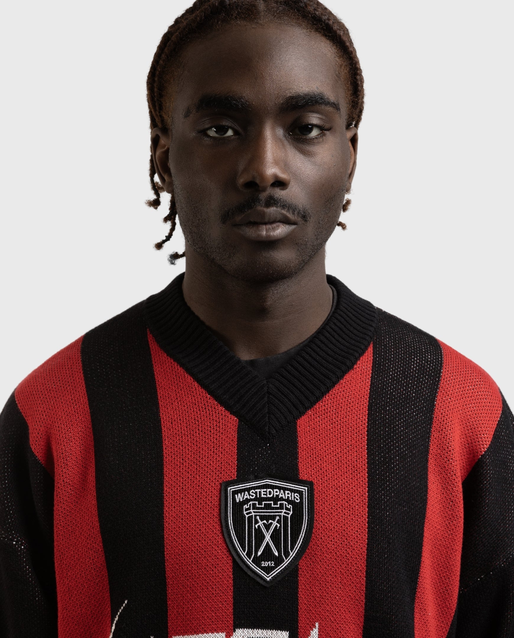 Deze unieke Blade Sweater van Wasted paris heeft verticale rode strepen. De basis van de sweater is zwart. Het gekende logo op de voorkant.