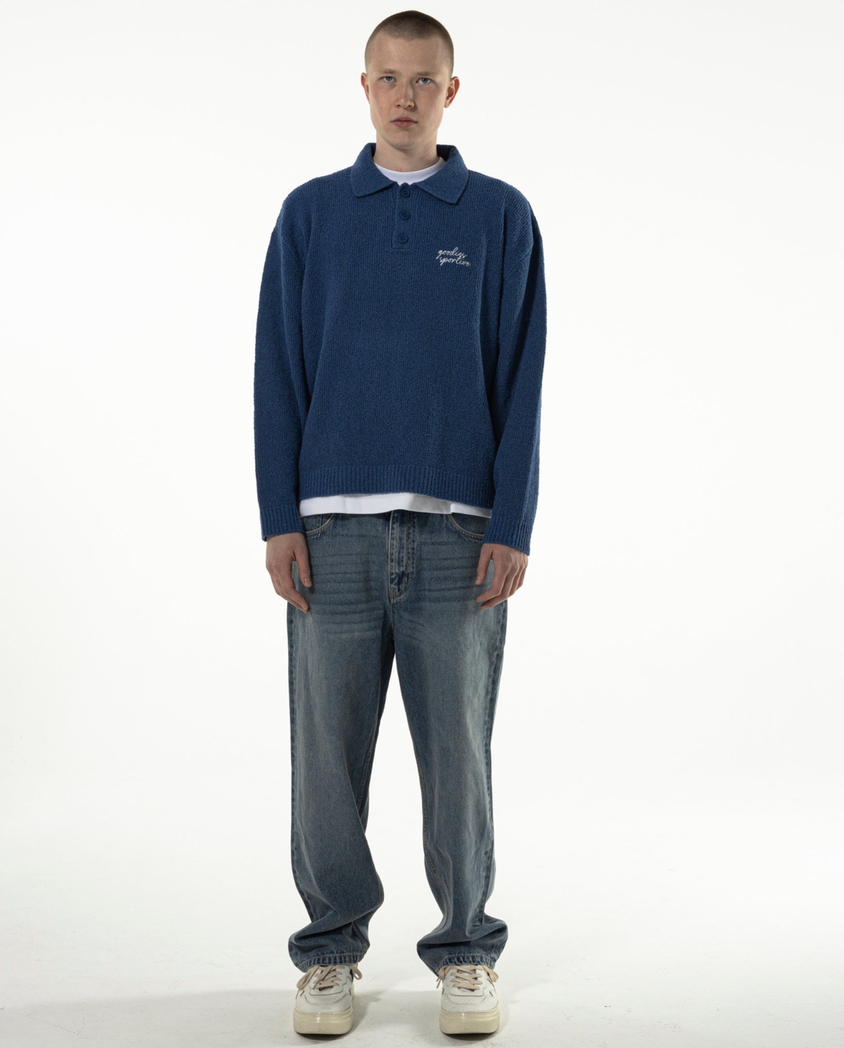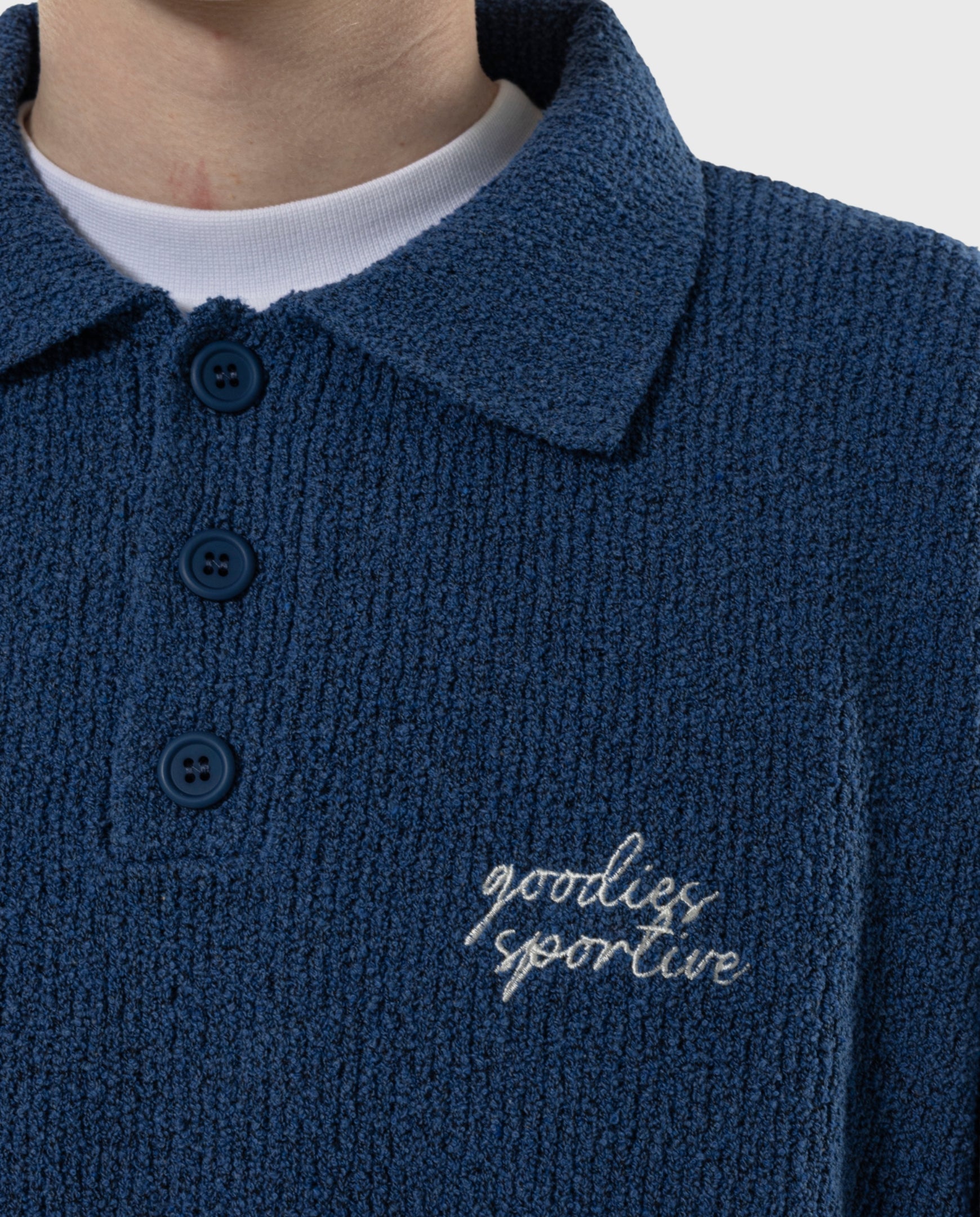 Longsleeve knitted polo van Goodies Sportive. Gemaakt in Portugal. Witte contrasterende borduring op de linkerborst.