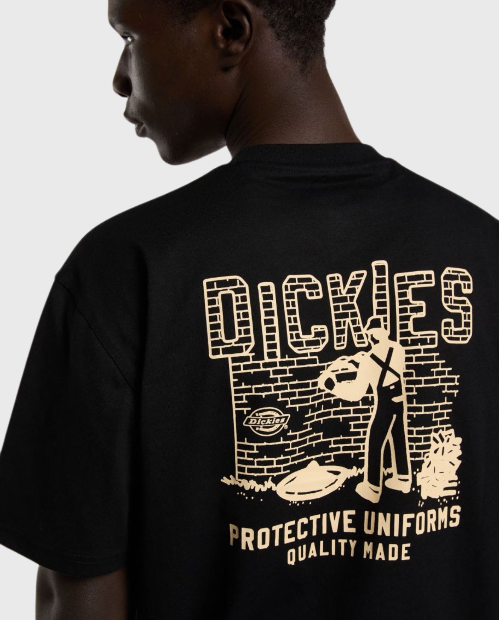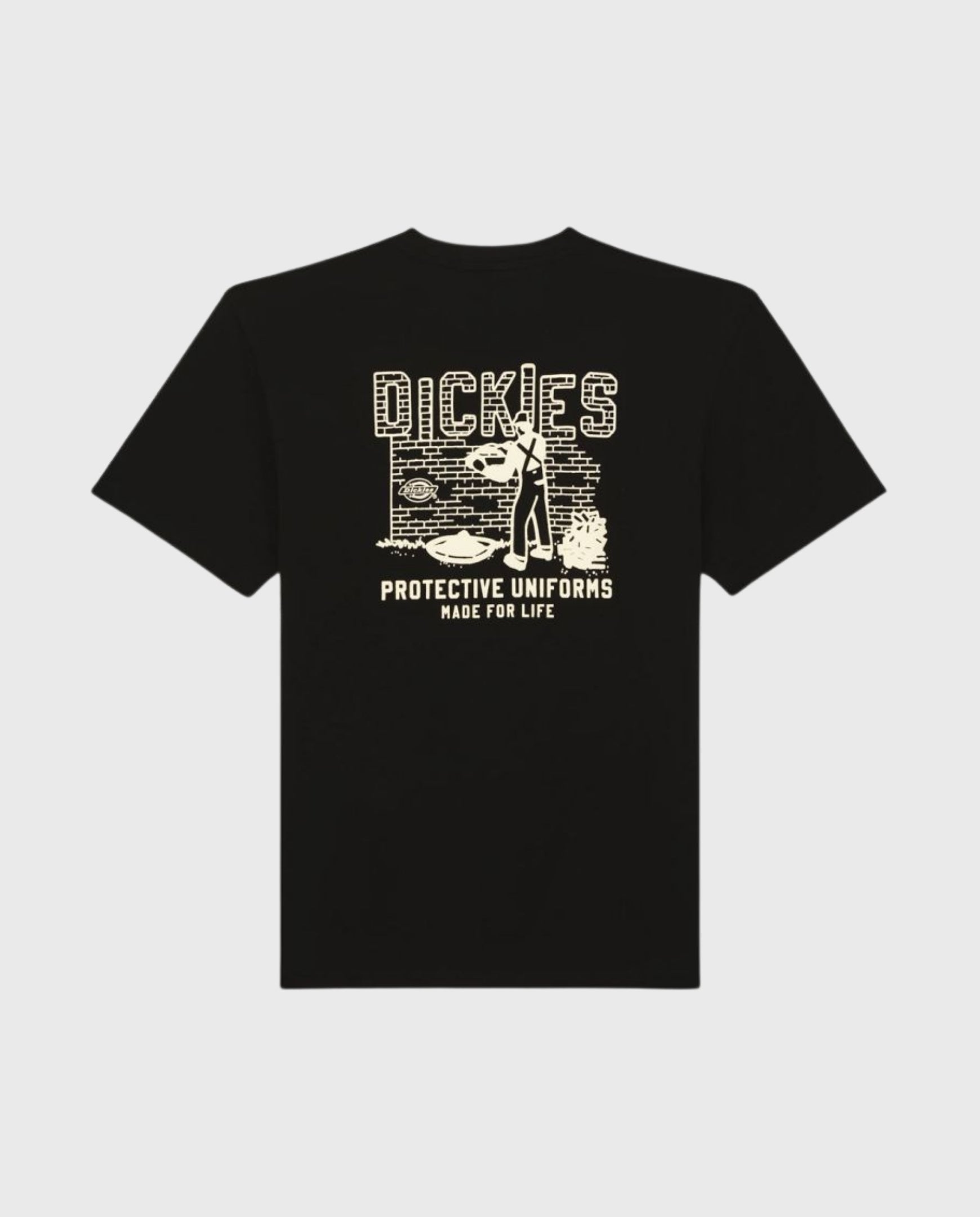 De relaxte pasvorm en de vintage prints, waaronder een baksteen-graphic op de borst en een 'Protective uniforms made for life'-print op de rug, geven het shirt een authentieke uitstraling.