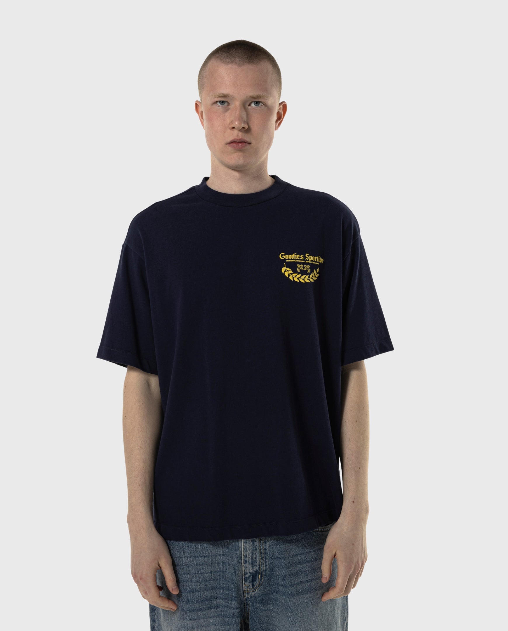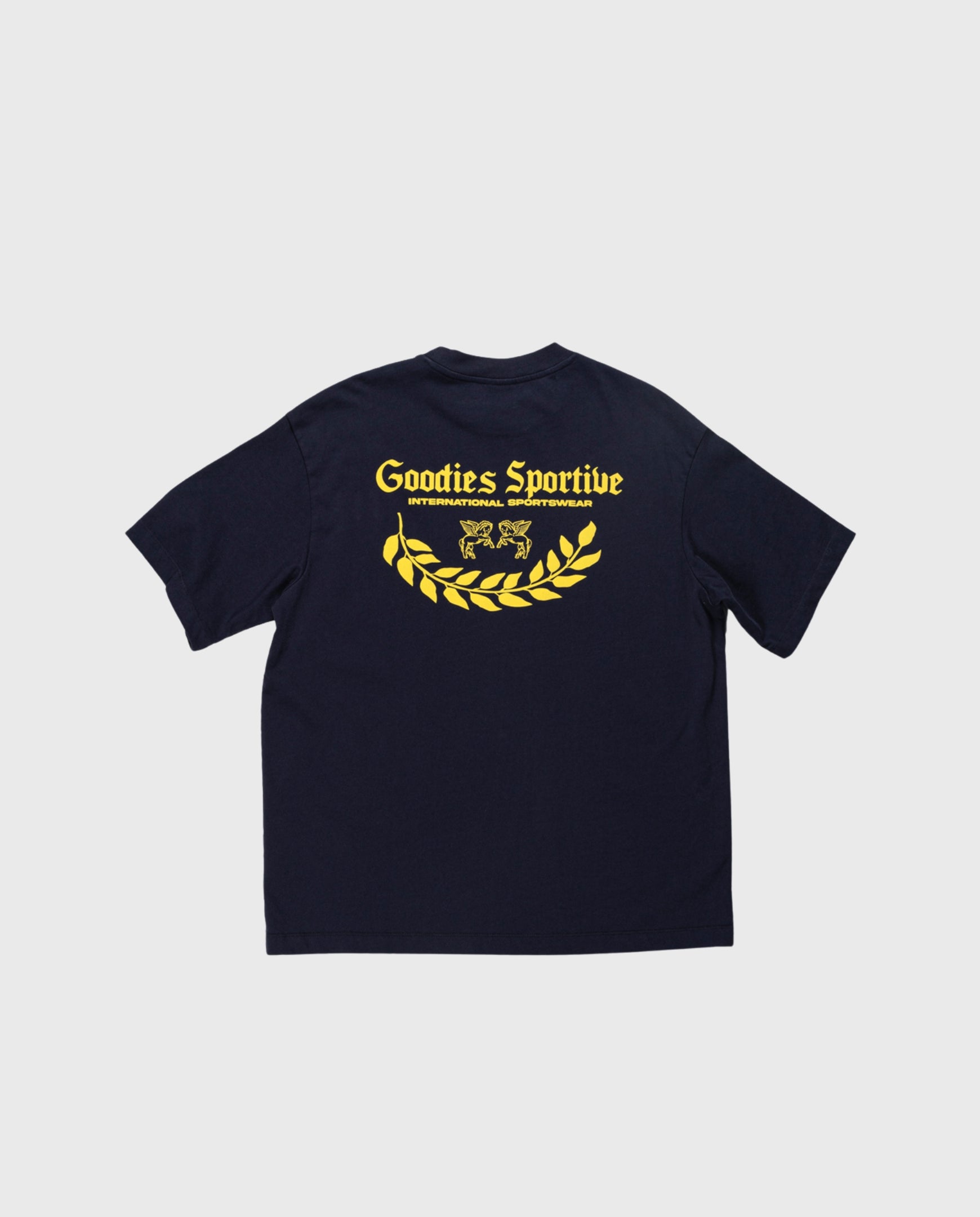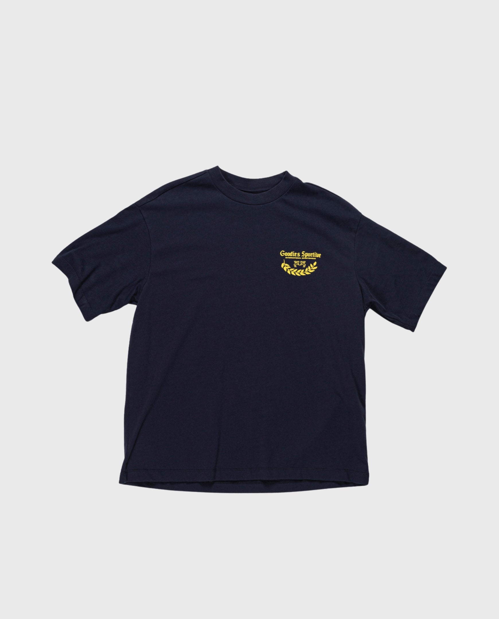 Donkerblauw t-shirt met gele opdrukken van Goodies Sportive. 290 GRMS organisch katoenen t-shirt. Relaxed fit.