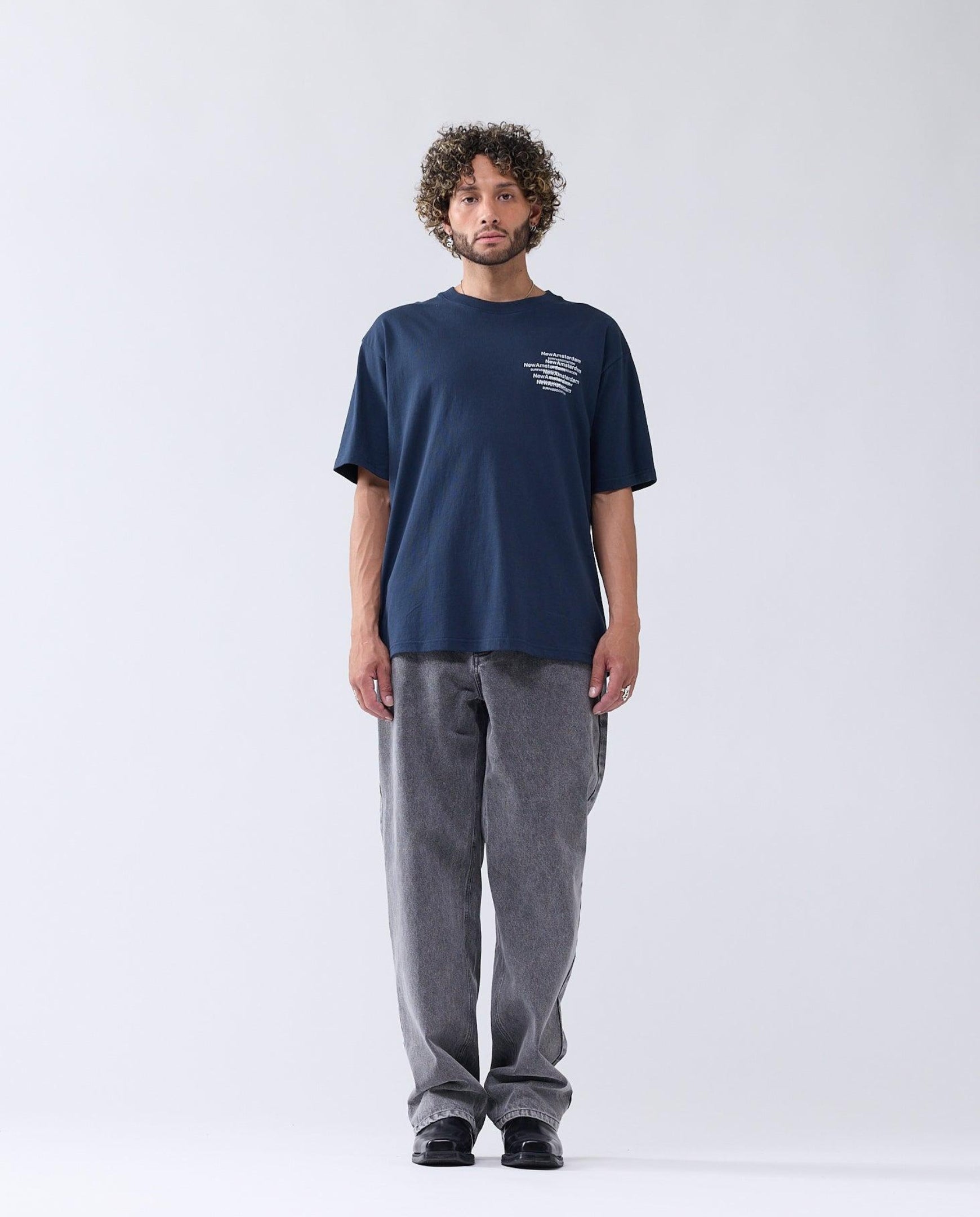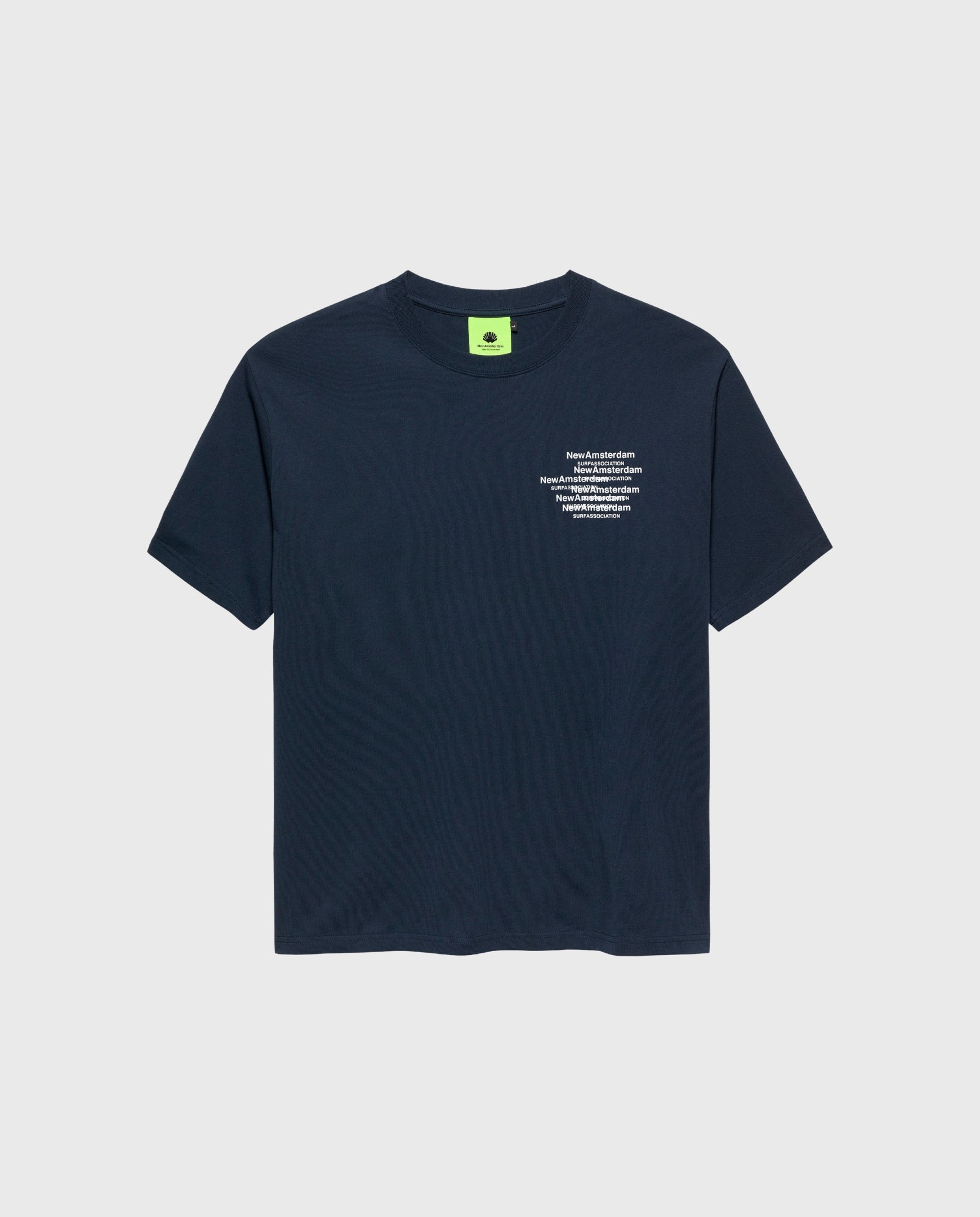 Donkerblauw Collage t-shirt van New Amsterdam Surf Association. Leuke backprint, subtielere print op de linkerborst.