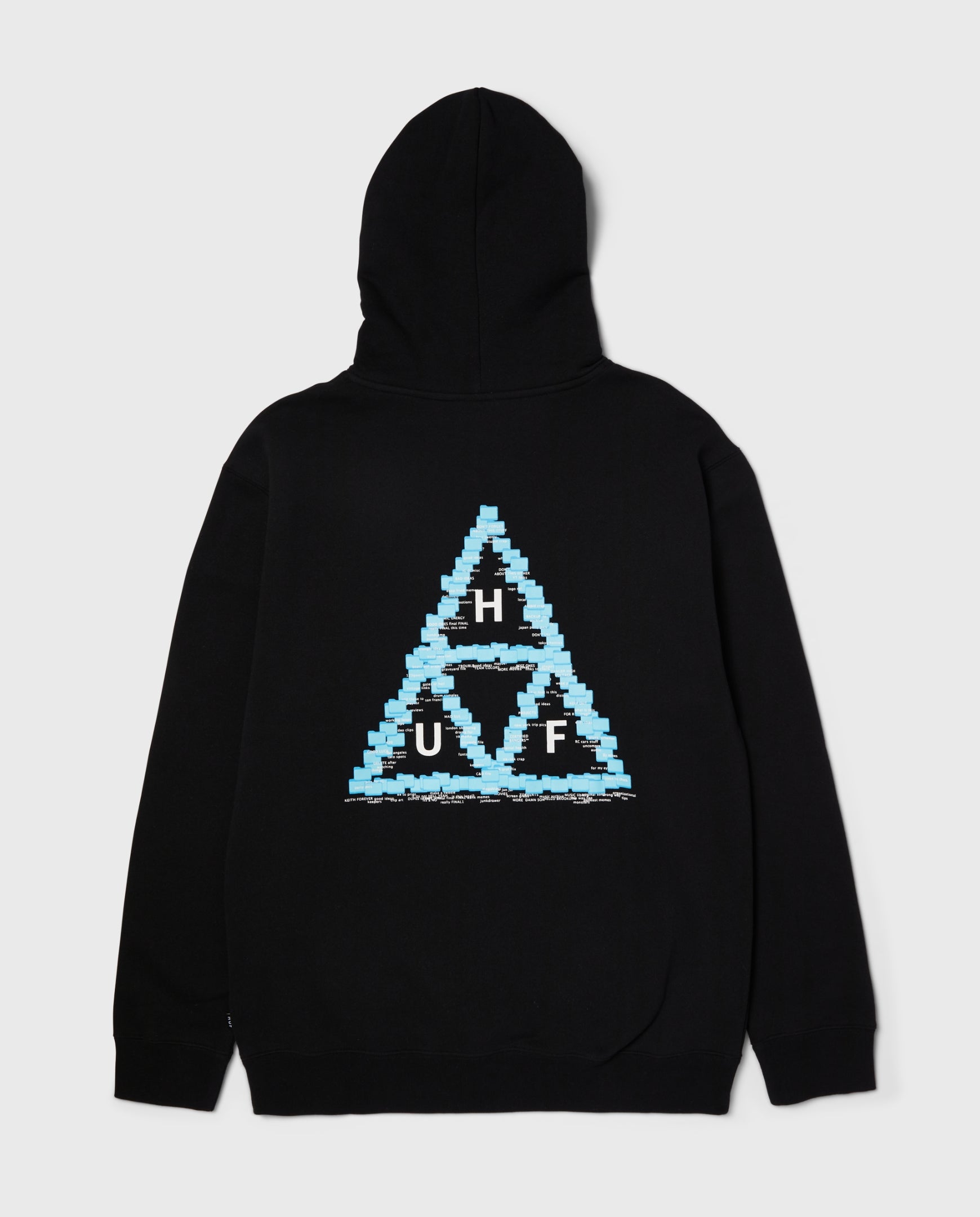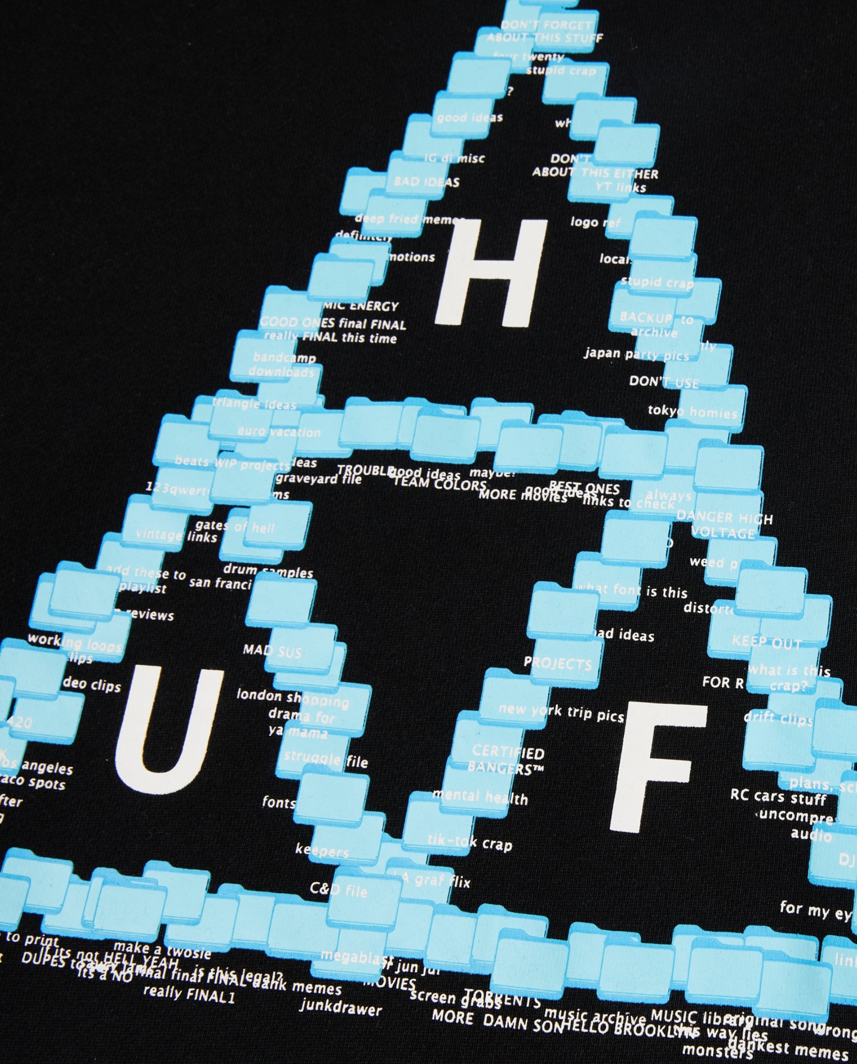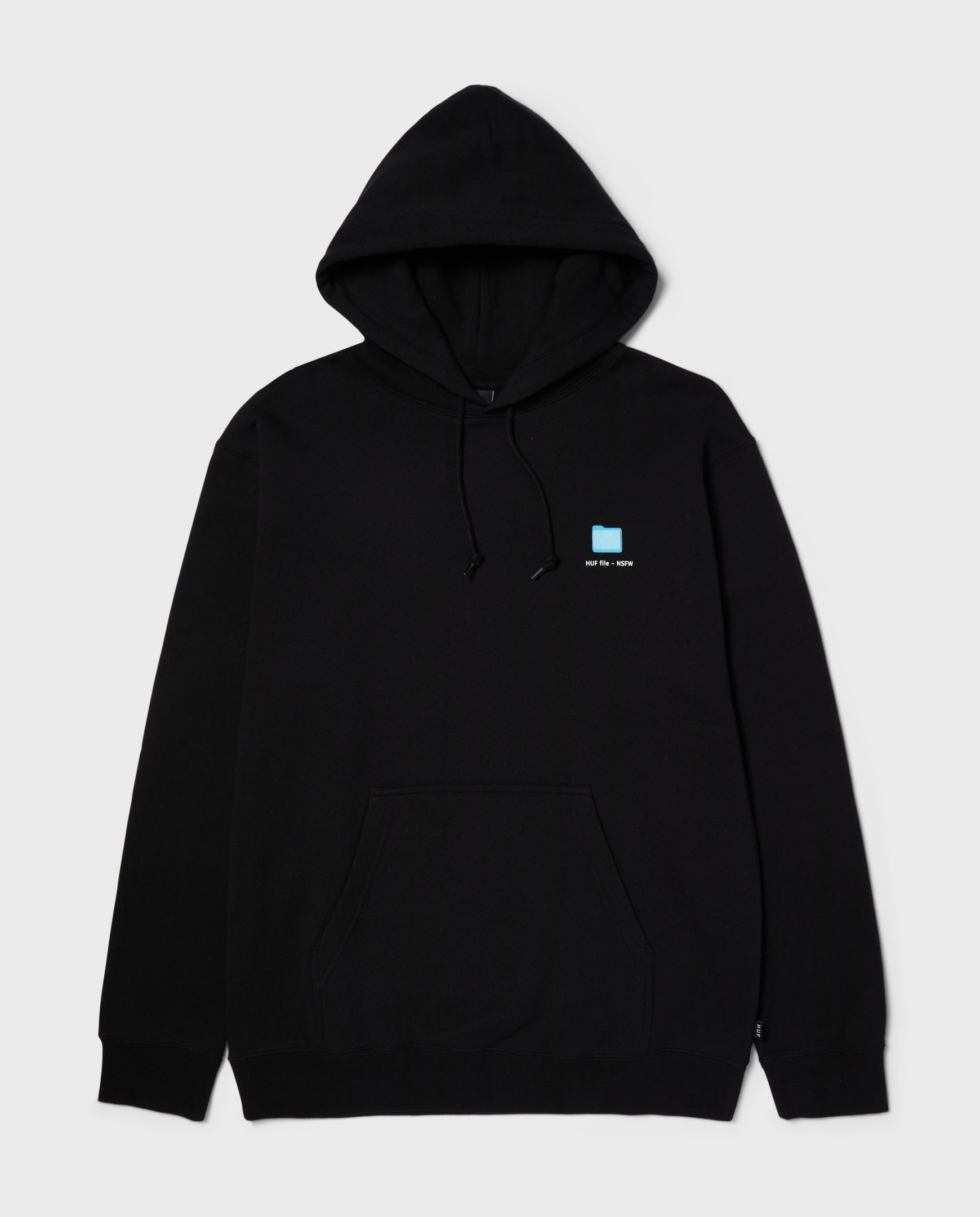 Zocht je een map? De Desktop Hoodie in het zwart van HUF. Subtiele map op de linkerborst, groot logo op de achterkant.