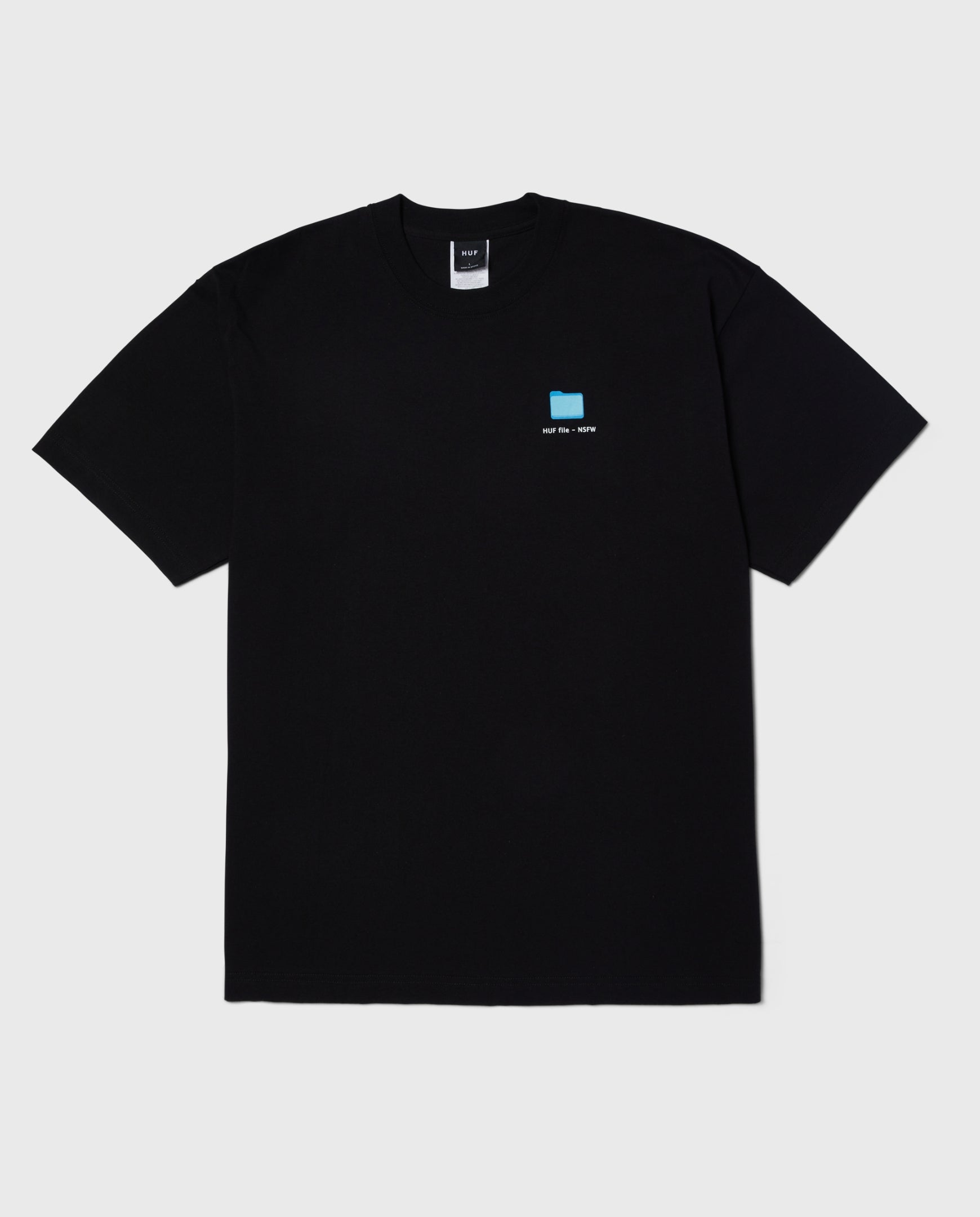 Het HUF Desktop T-Shirt in het zwart met blauwe details. Een subtiele map op de linkerborst in het blauw. Op de achterkant is de map verwerkt in het HUF logo.