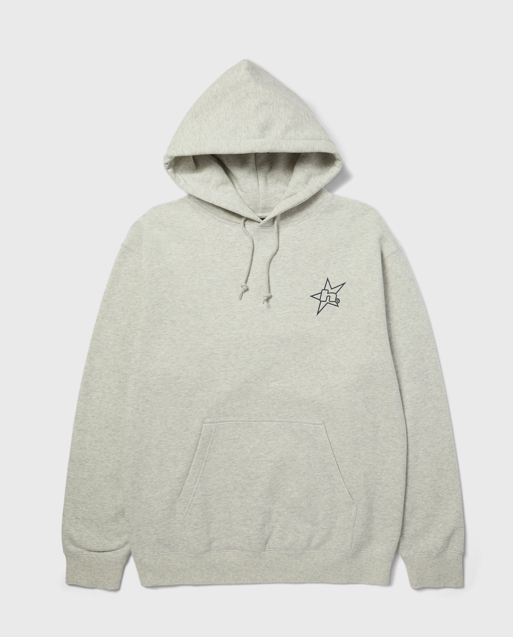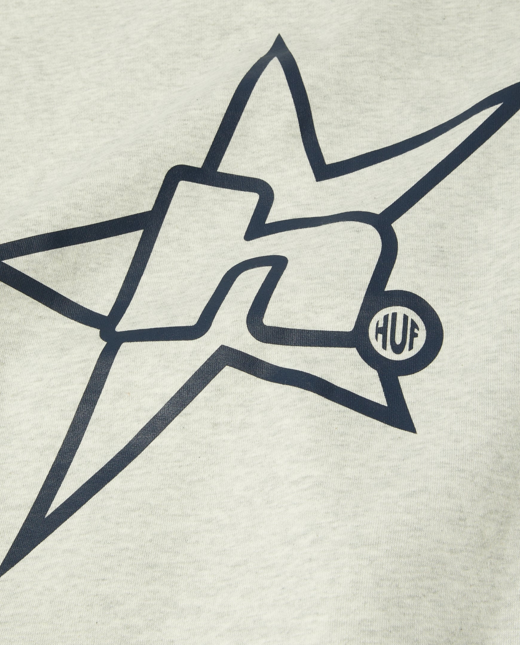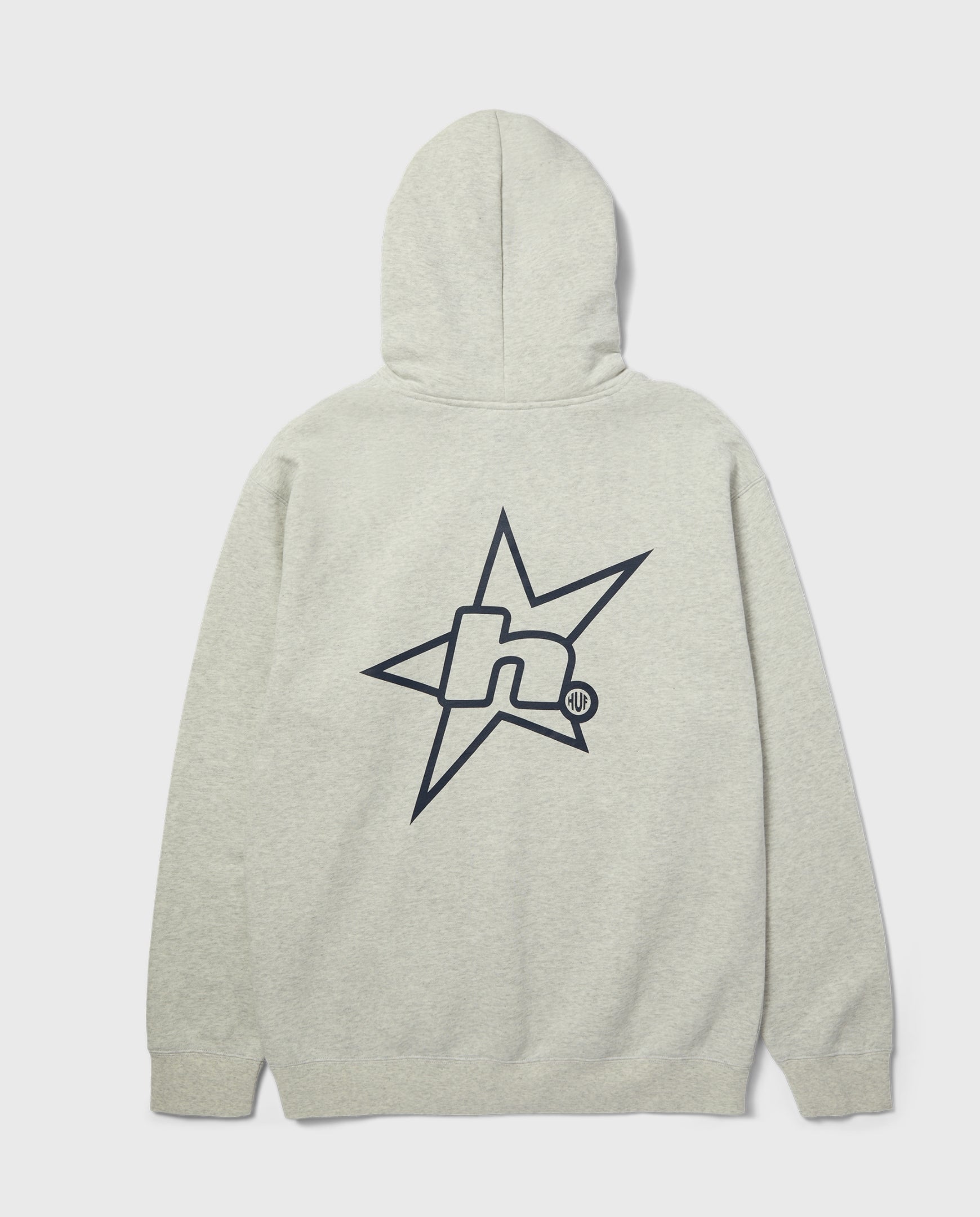 Het H-Star logo van Huf, verwerkt op de achterkant van deze grijze hoodie.