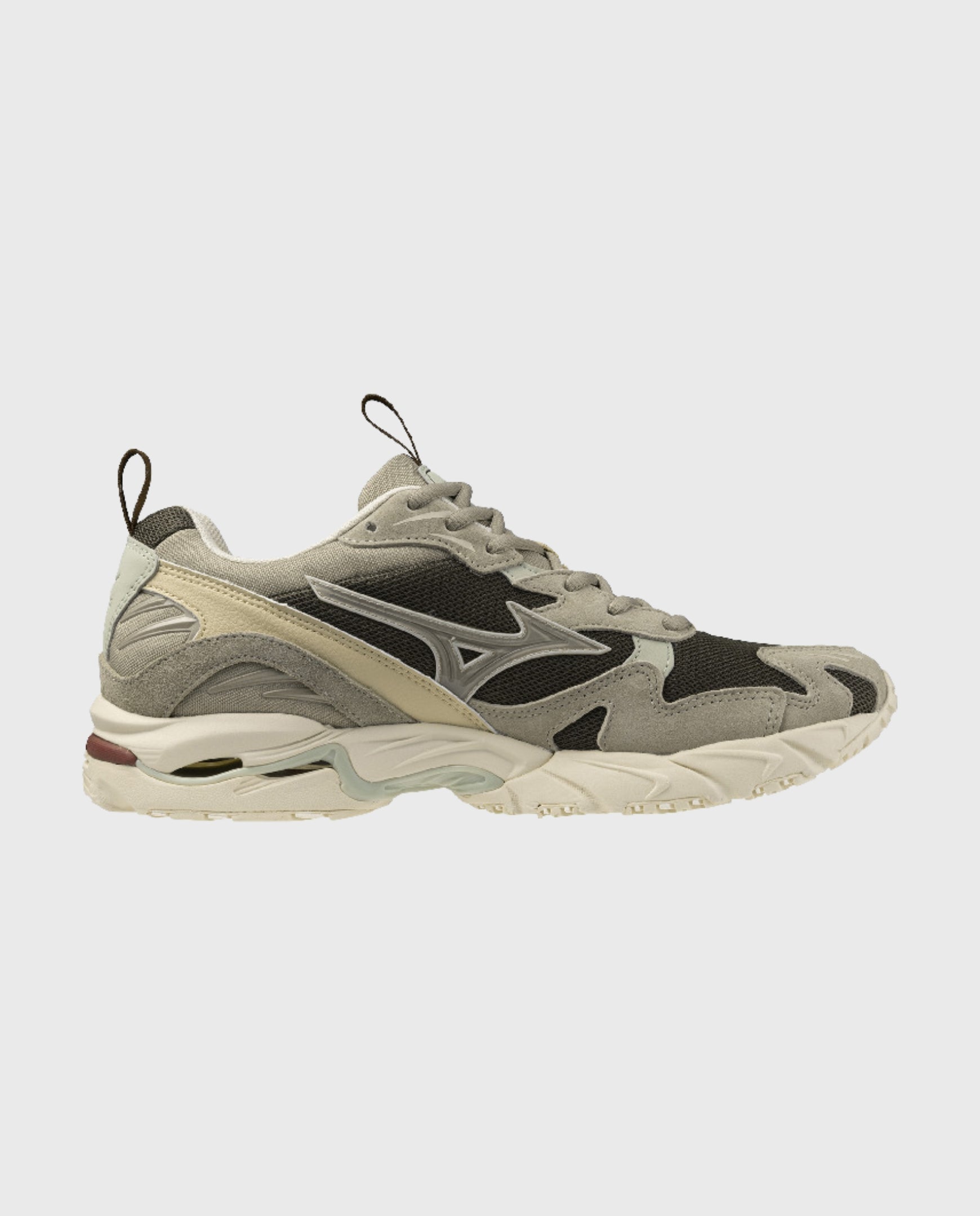 De Mizuno Wave Rider 10 in een subtiele kleurencombinatie met grijs en zwarte tinten.