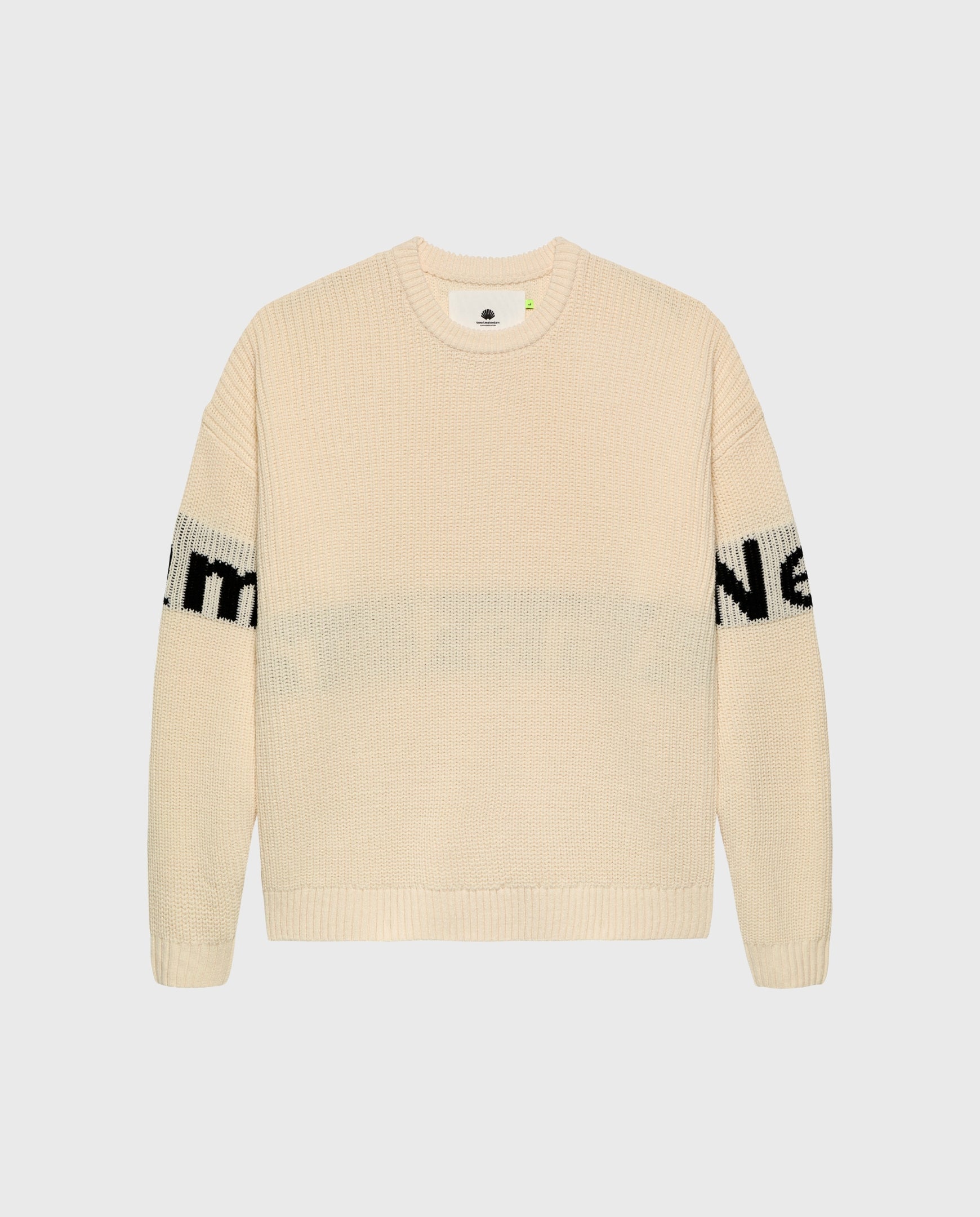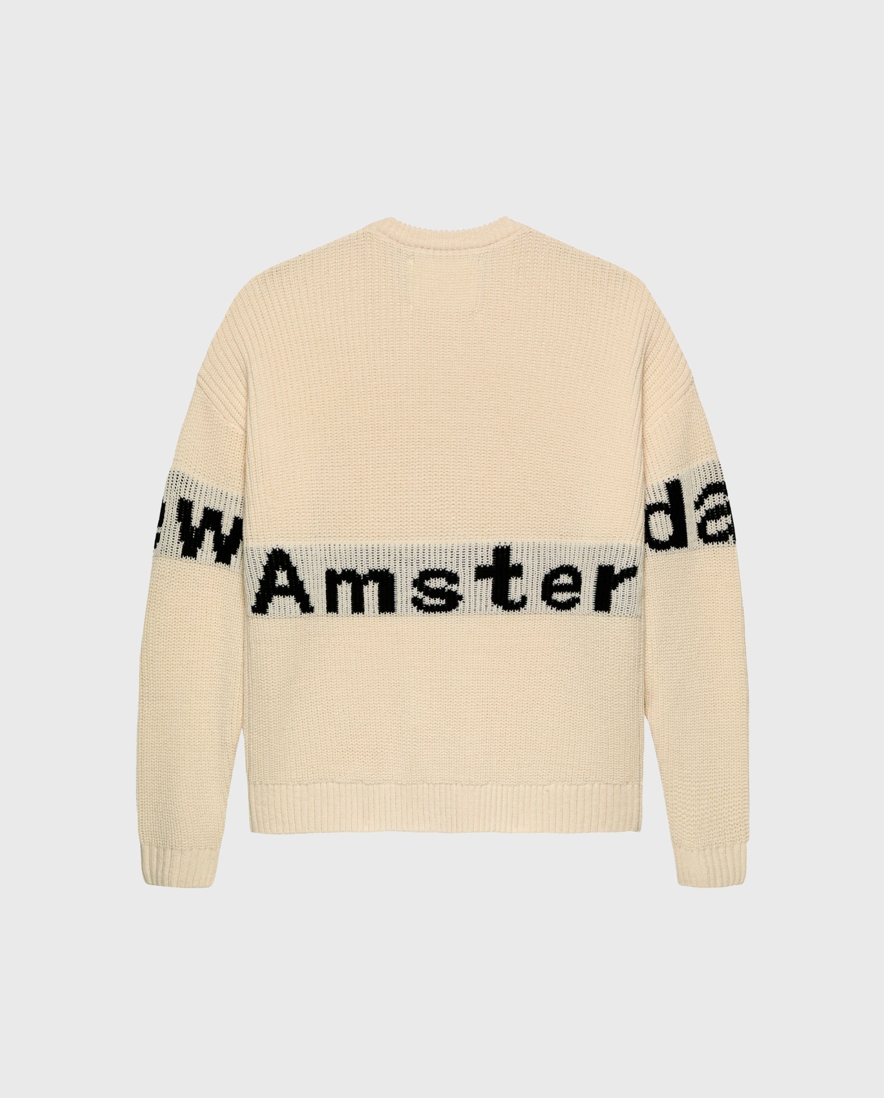 Deze ecru kleurige knit van New Amsterdam komt met een print verdeeld over de achterkant.