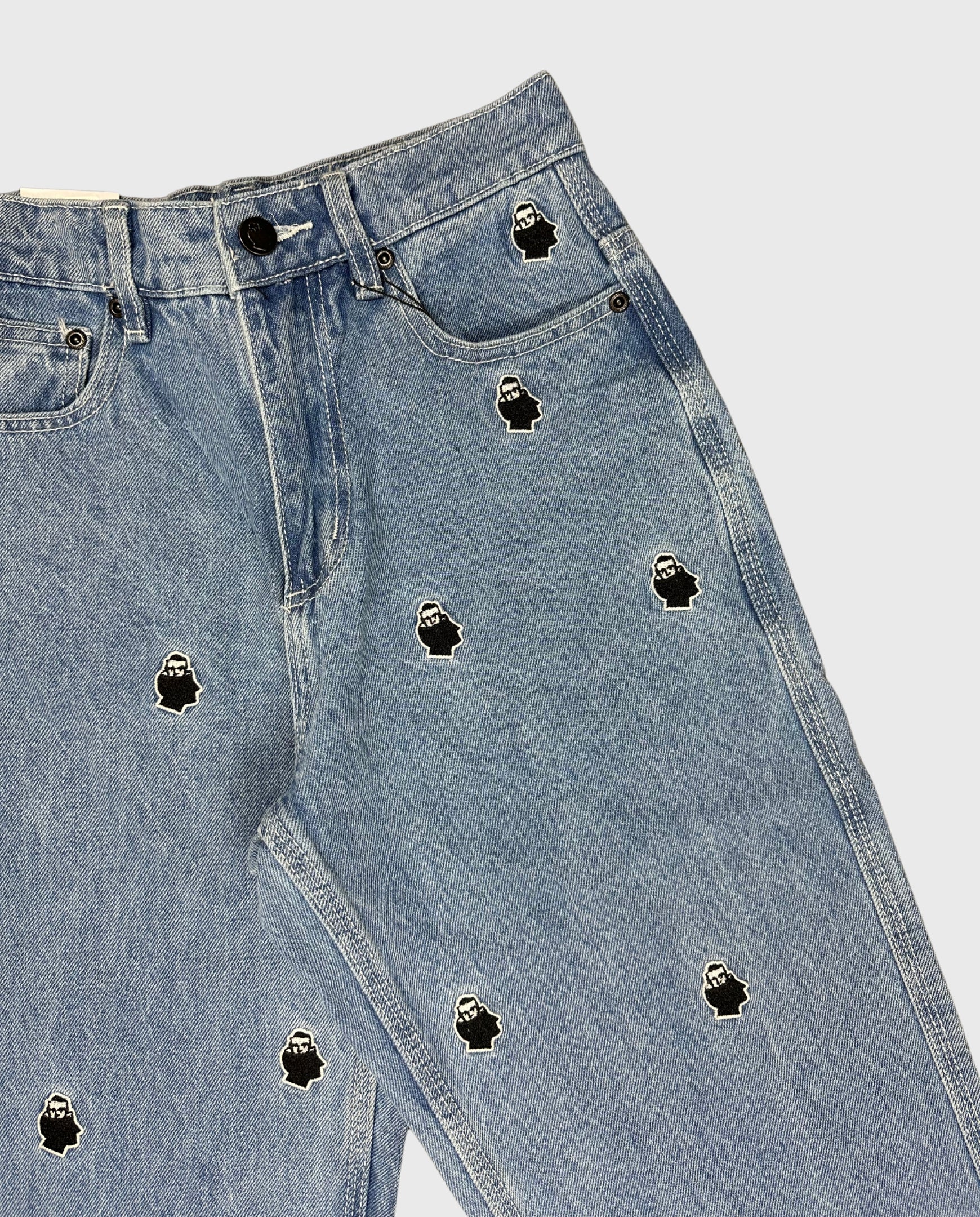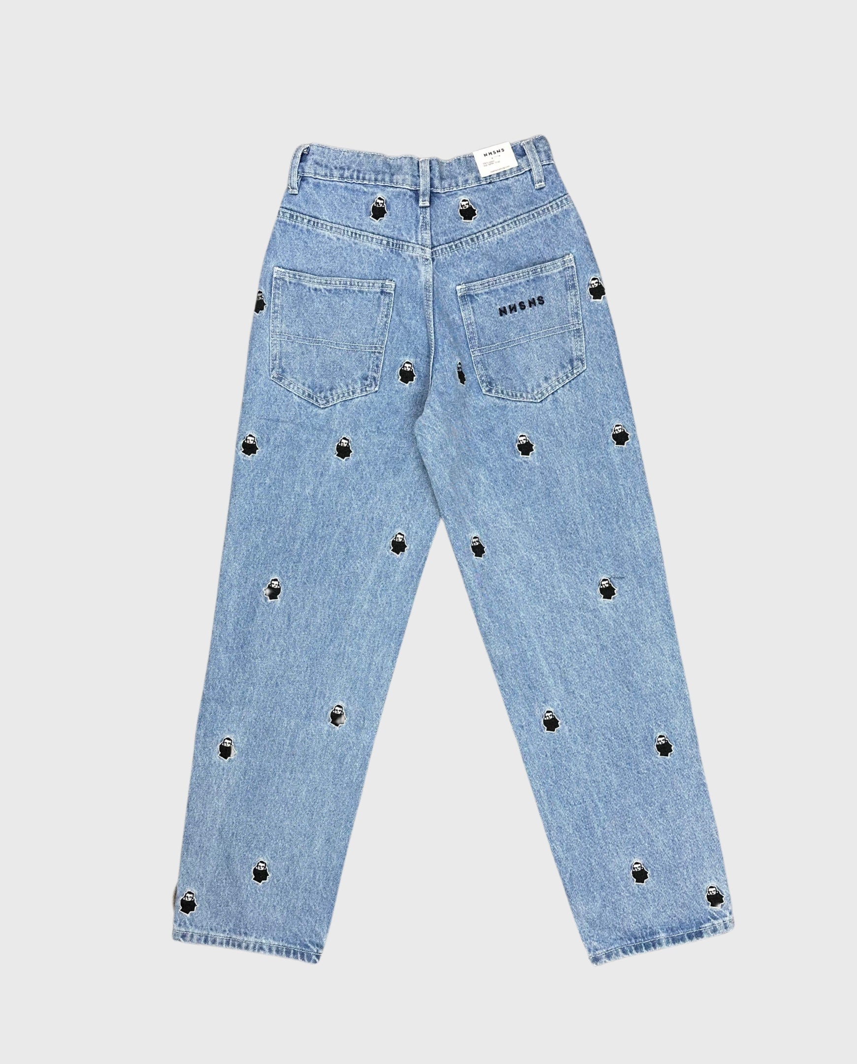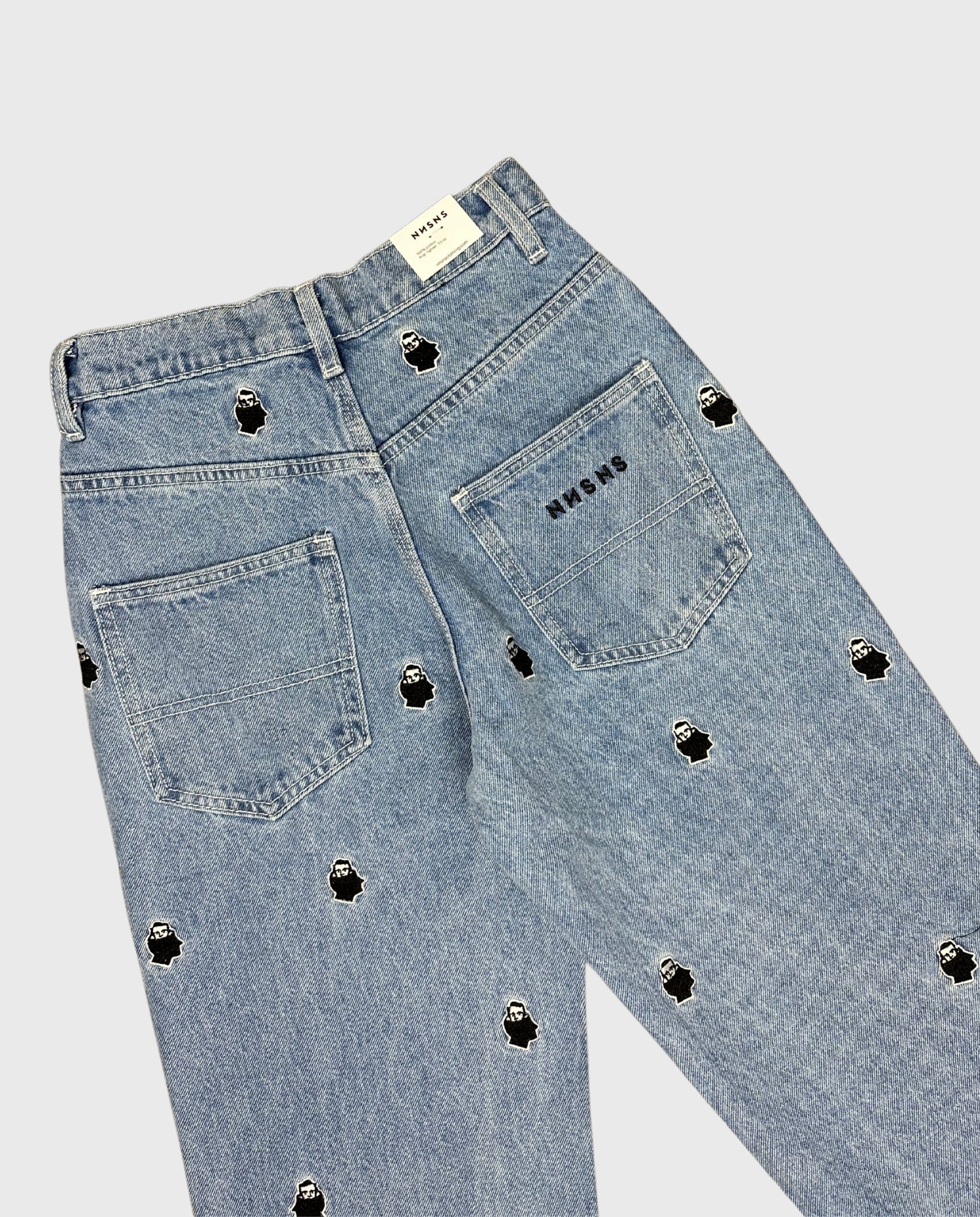 Deze Cloud Blue Bigfoot versie komt met een AOP -> All Over Print. over de hele jeans van NNSNS kan je het logo terugvinden.