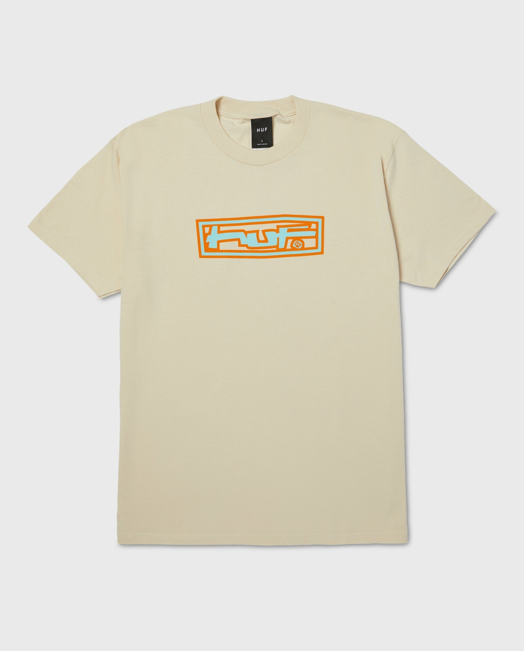 Dit beige t-shirt van Huf komt met een print op de voorkant. De stretch print op de voorkant is in het blauw en oranje.